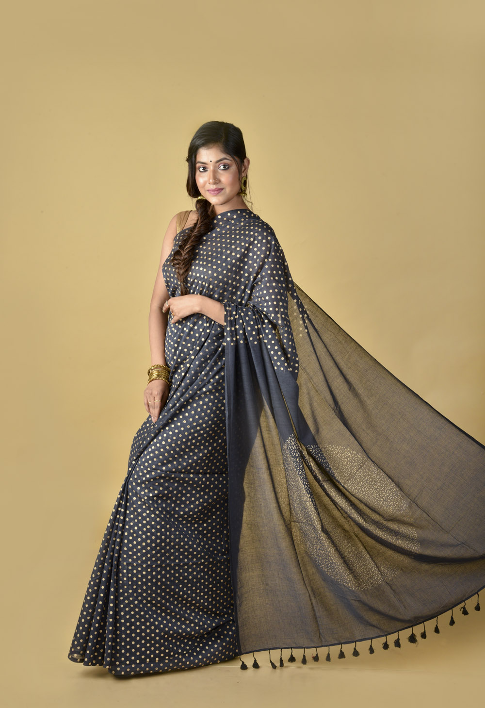 Abstract – Dark Gray & Gold – Hand Block Printed Cotton Saree