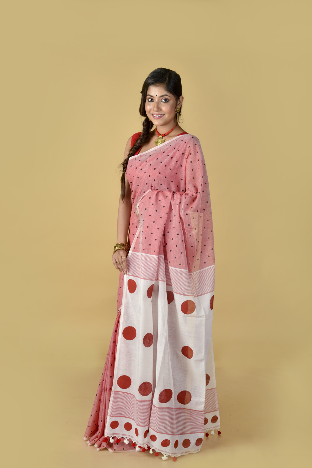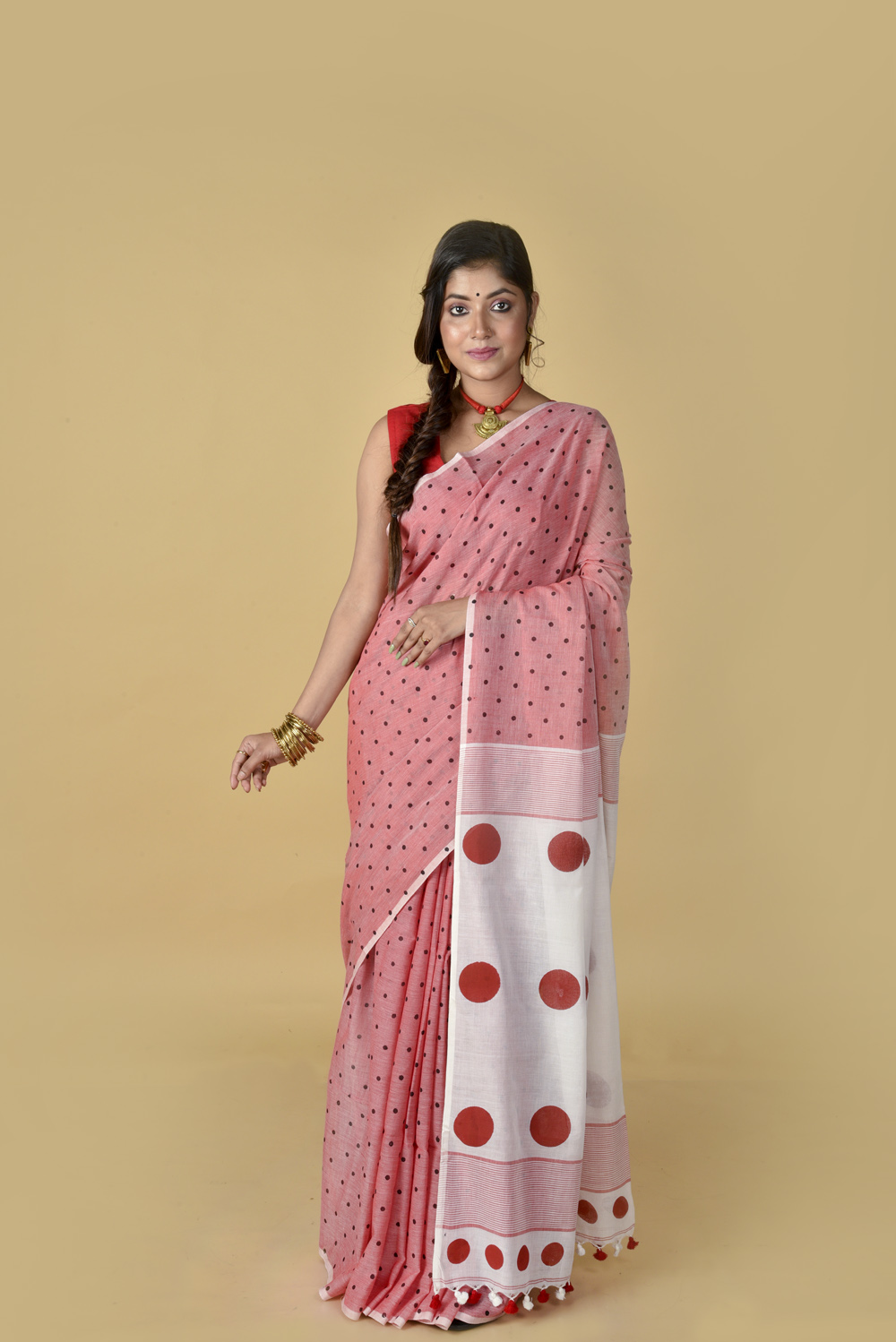Red White (All Over Black Dots) – Hand Block Printed Cotton Saree