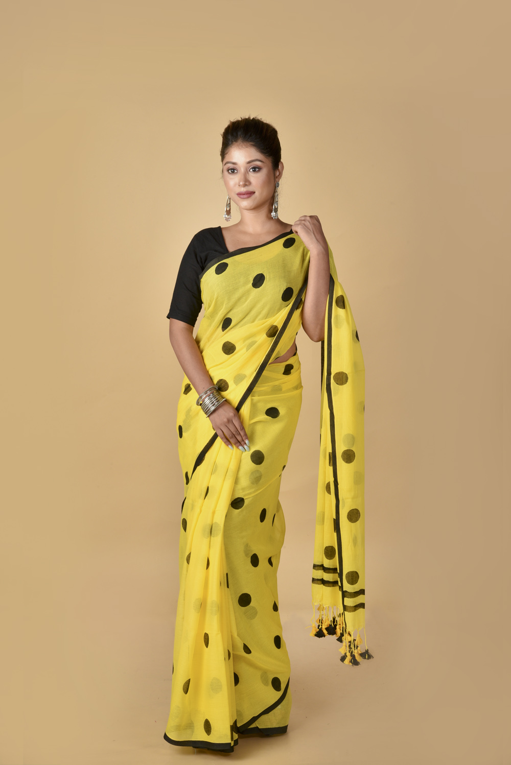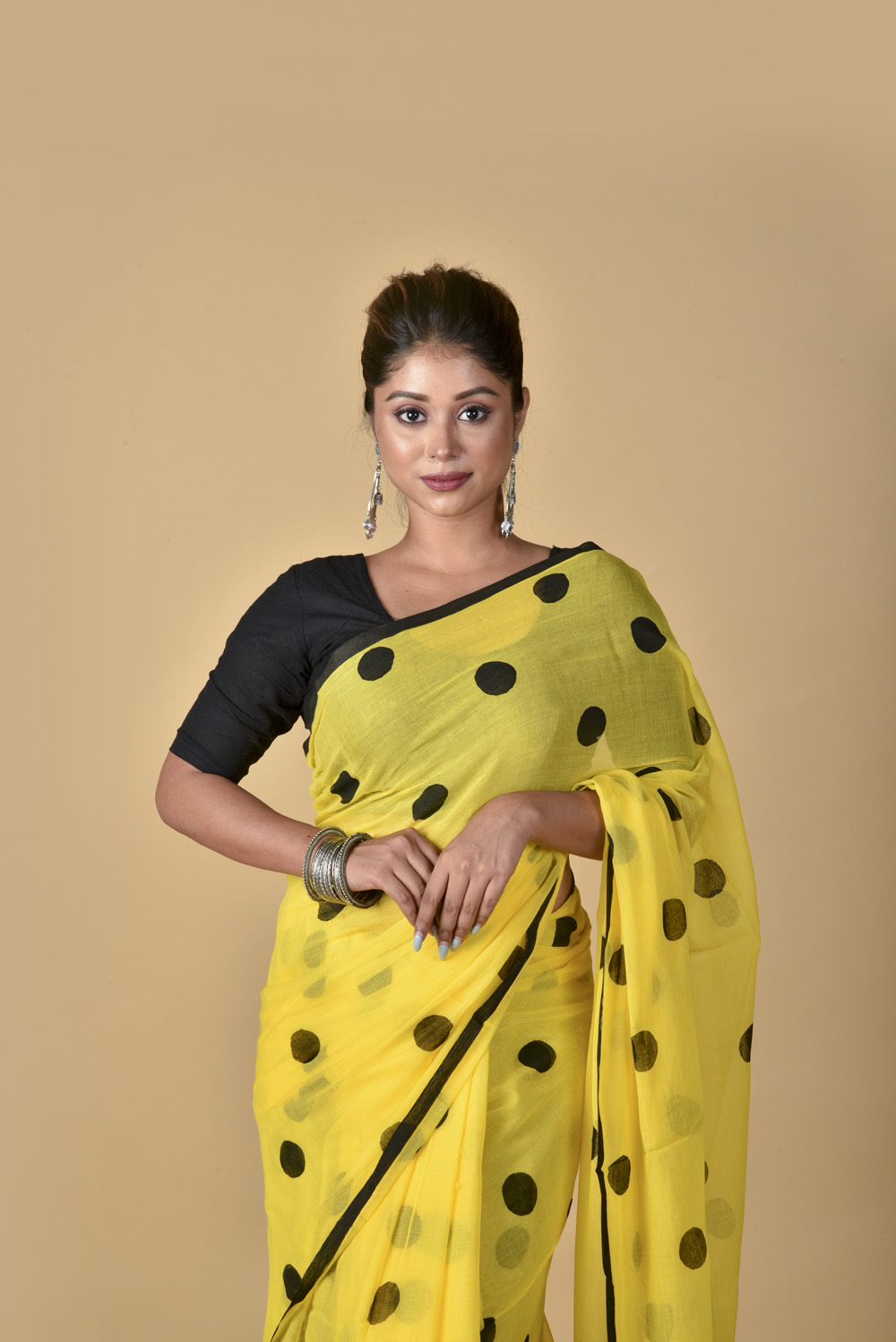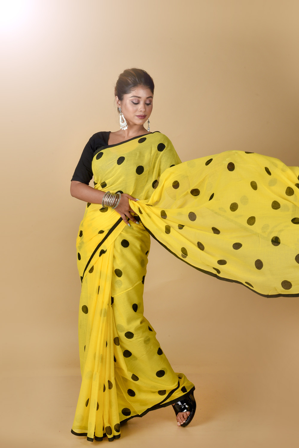Yellow Black Polka Dots – Hand Block Printed Cotton Saree